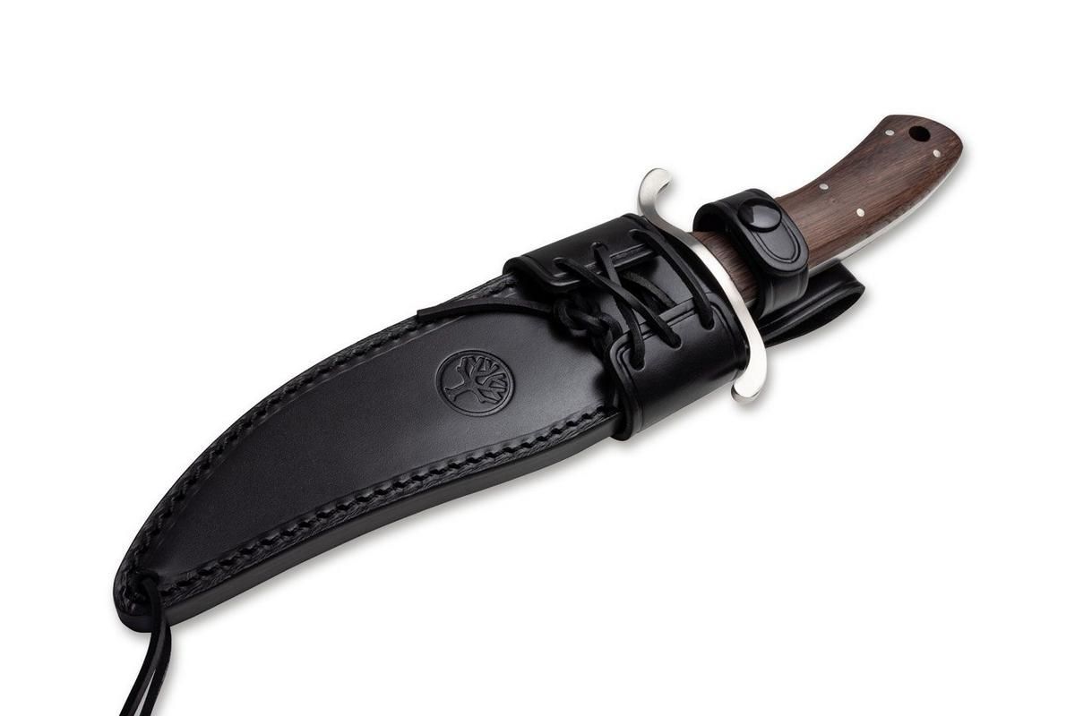 Das traditionelle Böker Bowie wurde nach Original-Entwürfen aus dem frühen 19. Jahrhundert konzipiert und ist mit einer extrem stabilen, 6,4 Millimeter starken Klinge aus N690 ausgestattet. Der Name des Messers geht auf James Jim Bowie zurück, der als berühmter Pionier und Soldat als Held des Wilden Westens verehrt wird. Entgegen den weitläufig kopierten Sheffield-Bowies entspricht das Outdoormesser in seinen Ausführungen den frühen amerikanischen Bowies mit S-förmigem Parierelement aus Edelstahl, dessen Oberfläche fein satiniert ist.