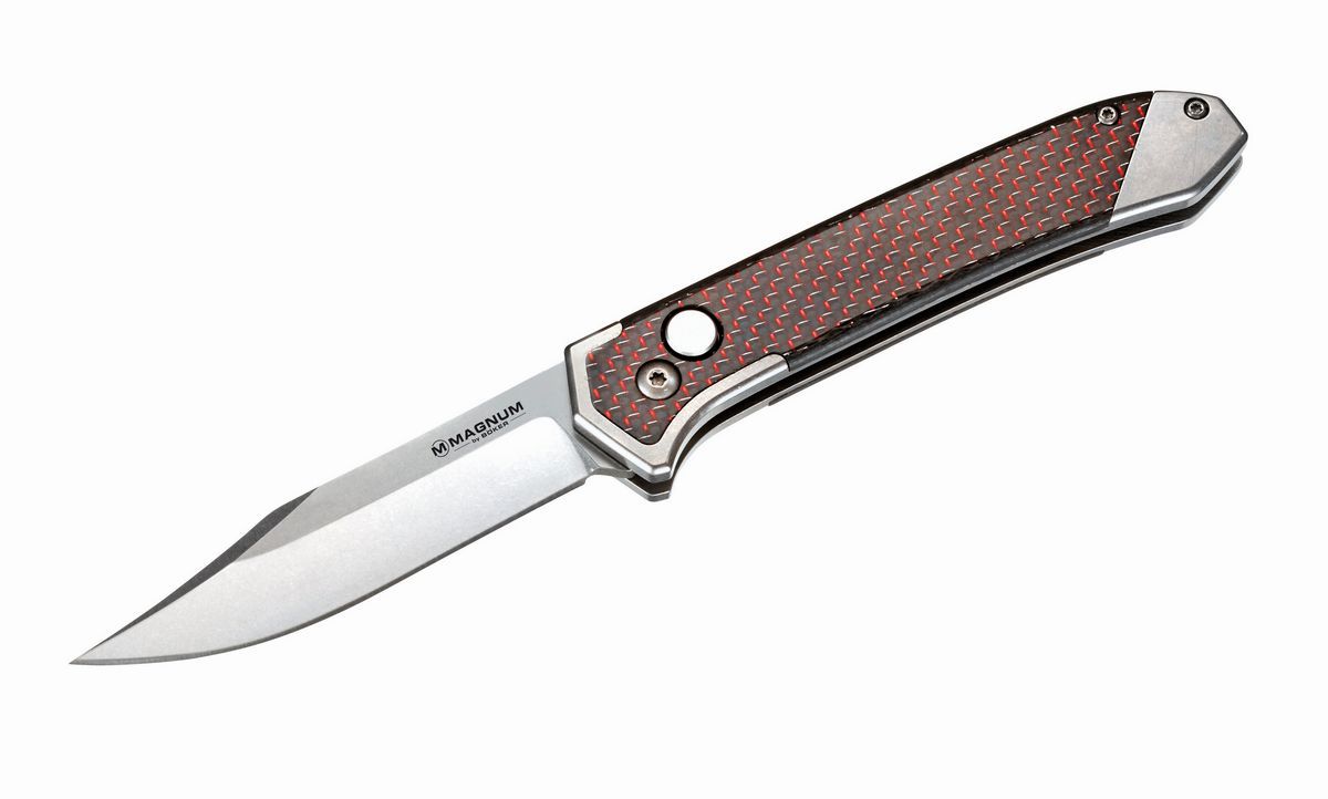 Das moderne Magnum Rubico Auto setzt auf innovative Materialien und einen kräftigen Springmechanismus. Die Klinge aus 440A ist mit einem hellen Stonewash-Finish versehen und öffnet automatisch per Druckknopf. Zum Schließen der Klinge muss der Knopf erneut betätigt werden. Als Griffmaterial kommt rot schimmernde Kohlefaser zum Einsatz, die dem Taschenmesser eine ganz besondere Anmutung verleiht. Mit Clip (Tip-Up).
