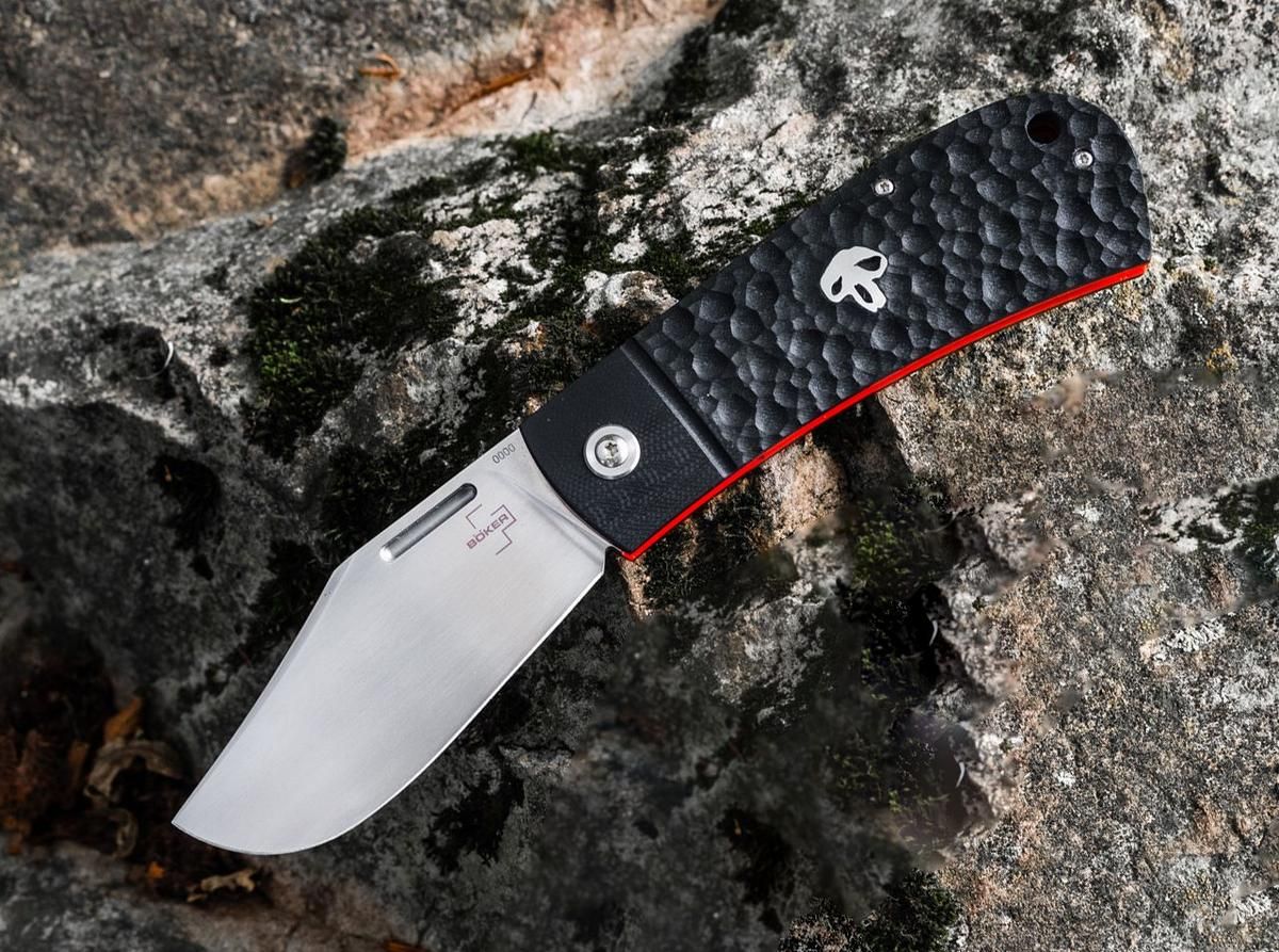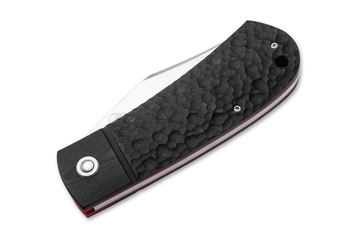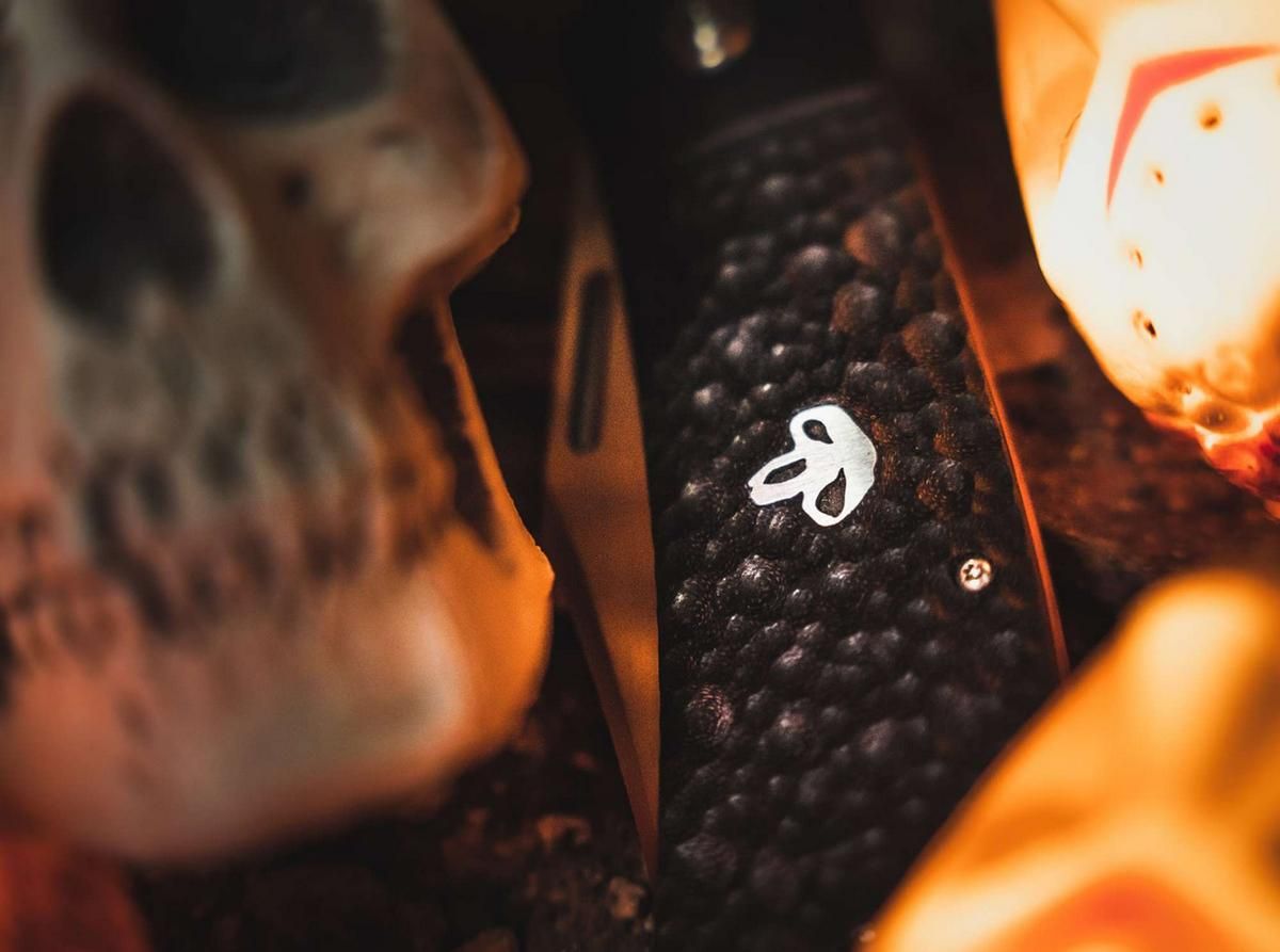 Die breite Clippoint-Klinge wird aus D2 gefertigt und ist mit einem feinen Hairline-Finish sowie einer ausgeprägten Fehlschärfe versehen. Das Messer wird per Nagelhau geöffnet und verriegelt nicht. Die außergewöhnlichen Griffschalen aus G10 sind mit einer groben Texturierung versehen, die an eine rustikale Schmiedehaut erinnert. Angedeutete Backen, rote Fiberlagen aus G10 und ein stilisiertes Totenkopf-Emblem auf der Vorderseite untermalen den provokanten Charakter des Messers. Mit Fangriemenöse und hochwertigem Nylon-Etui zur Aufbewahrung.