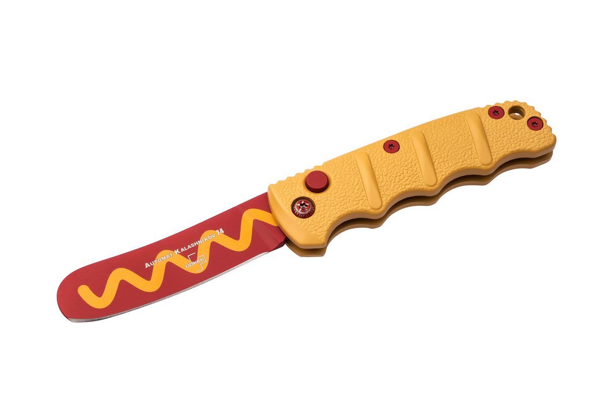 Der Böker Plus BHQ AKS-74 Mini Wiener Warrior bereichert unsere geliebte Kalashnikov-Serie um eine leckere Hot Dog-Version. Der gelbe Aluminiumgriff erinnert an frische goldgelbe Semmel.