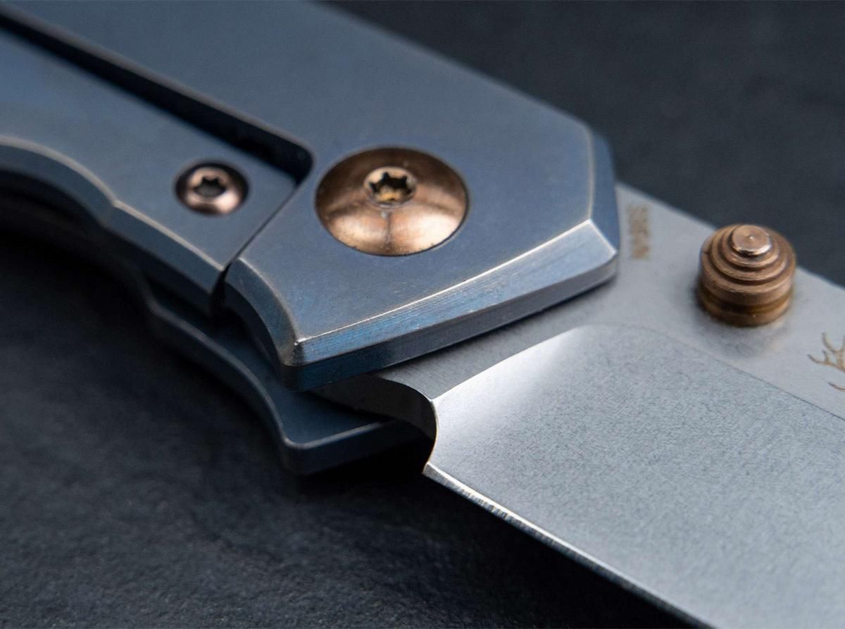 Joe Mangiaficos moderne und markante Interpretation der klassischen Canoe Messer-Bauform überzeugt mit einer kugelgelagerten Droppoint-Klinge aus CPM-S-35VN im Stonewash-Finish und einem blau nuancierten Titangriff. Dekorative Akzente setzen dabei die in Bronze gehaltenen Elemente wie Klingenachsschraube, der Daumenpin sowie der Titan Clip (Tip-Up/r).