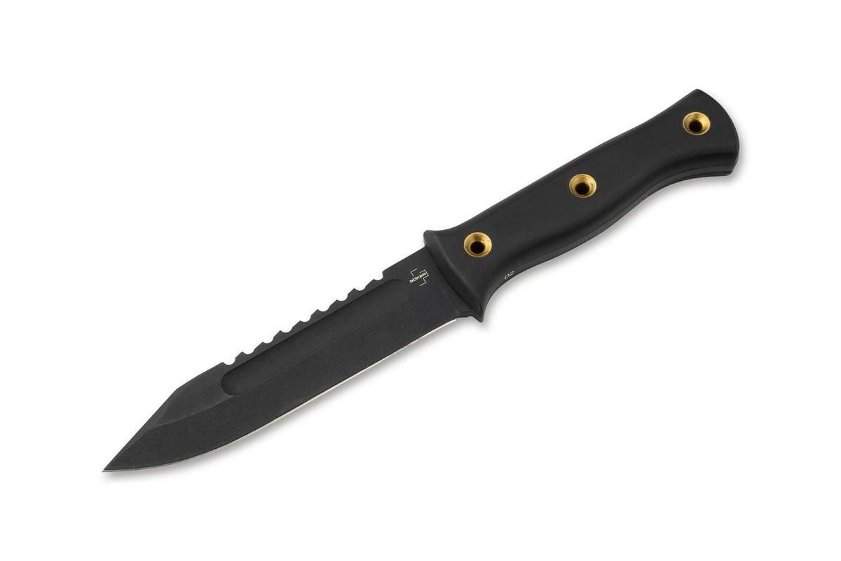 Unterstrichen wird der militärische Charakter des feststehenden Messers durch die beidseitige Hohlkehle sowie dem markanten Sägerücken. Die ergonomischen Griffschalen aus G10 versprechen eine angenehme Handlage sowie Griffsicherheit in jeder Situation.
