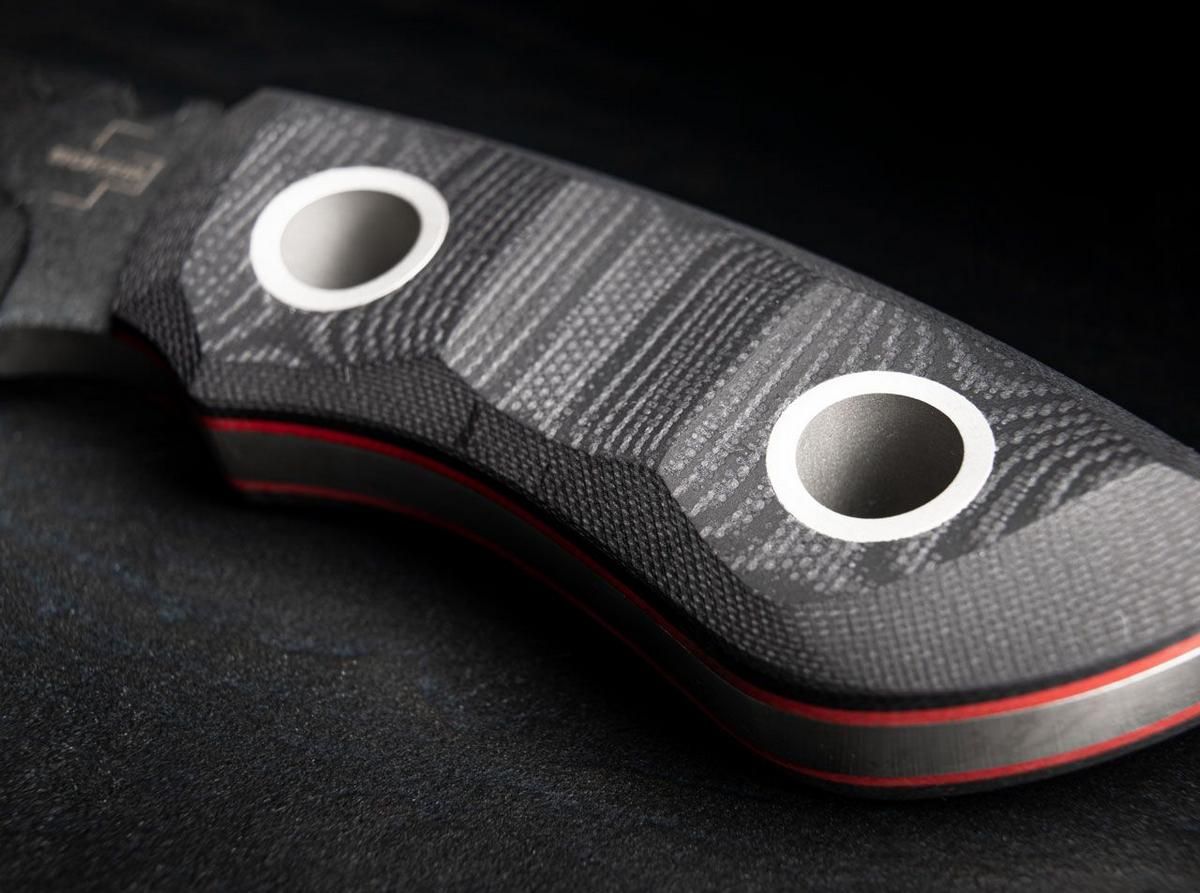 Ergonomisch gefräste Griffschalen aus Micarta und tiefe Daumenrillen geben der Hand optimalen Halt, während die rote Fiberlage einen reizvollen Kontrast zum mächtigen Klingenrücken bildet. Der Hohlschliff sorgt trotz der ungewöhnlichen Dimensionierung der Stonewash-Klinge für ausgewogene Schneideigenschaften.