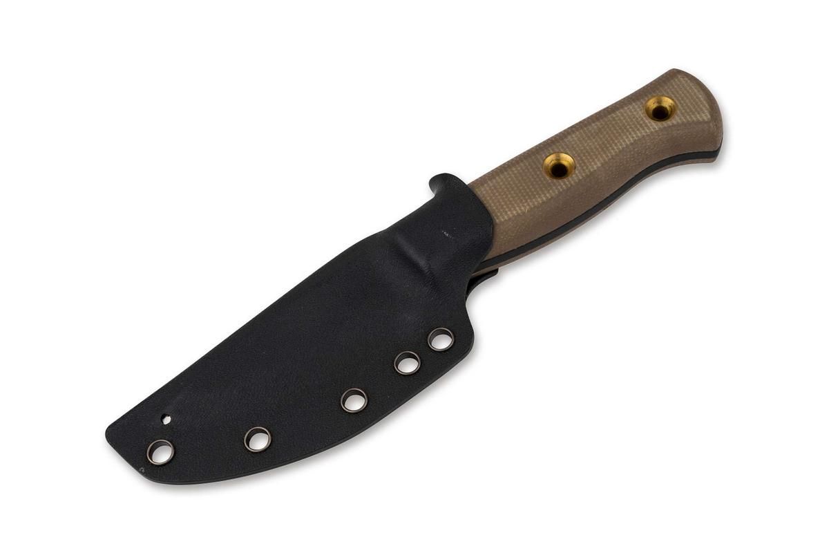 Die konturierten Griffschalen aus Micarta liefern in jeder Situation festen Halt und sind mit drei Messinghohlnieten versehen, die auch als Fangriemenöse Verwendung finden. Lieferung mit passgenauer Kydexscheide und Gürteladapter.