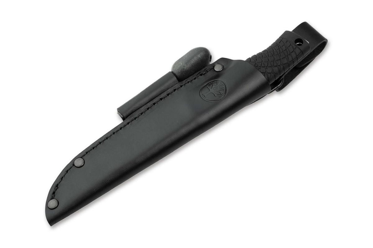 Die universale breite Droppoint-Klinge mit hoch angesetztem Saber-Grind ist seit jeher die bevorzugte Form des Jägers für Hoch- und Niederwild und eignet sich außerdem sowohl für feine Aufgaben wie das Stöckefedern als auch fürs Grobe wie das obligatorische Batoning. Der Erl ist durchgängig und ragt einige Millimeter aus dem Griffende. Das sorgt für das Maximum an Stabilität und die Angel verträgt auch kräftige Schläge mit einem Rundholz oder anderem Gegenstand. Ein kurzer Teil des Klingenrückens bildet beidseitig scharfe 90°-Kanten zum Funken schlagen aus dem mitgelieferten Feuerstarter. Als Griffmaterial wurde TPE thermoplastisches Elastomer gewählt, das den Erl vollständig umschließt und mit einer in jede Belastungsrichtung griffigen Struktur versehen ist. TPE ist widerstandsfähig, elastisch, rutschfest und hat eine geringe Wärmeleitfähigkeit. Das Messer liegt also bei allen Witterungs- und Arbeitsbedingungen sicher in der Hand und zieht bei Nässe und Kälte die Kraft nicht aus den Fingern. Gegenüber gewöhnlichen Elastomeren hat TPE zudem den Vorzug die Umwelt in der Fertigung zu entlasten, da diese rein physikalisch erfolgt und die langwierige und energieaufwändige Vulkanisierung chemisch vernetzter Elastomere entfällt.