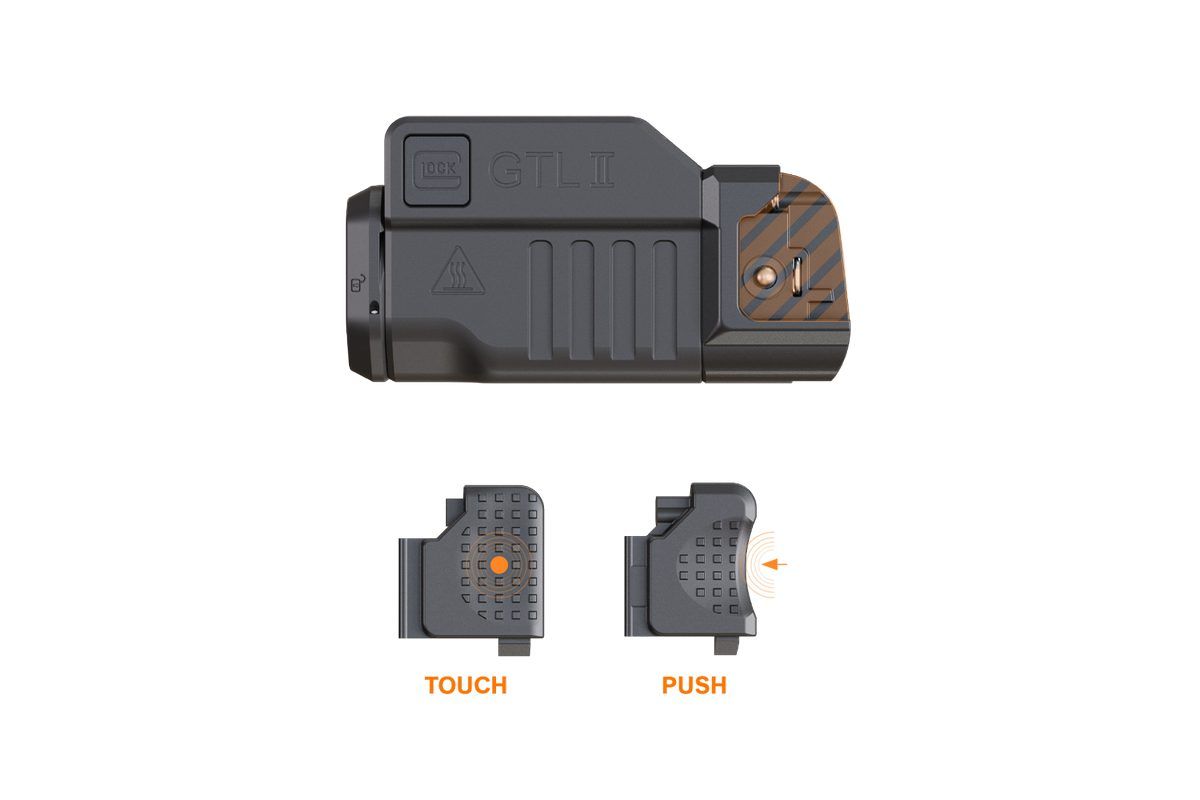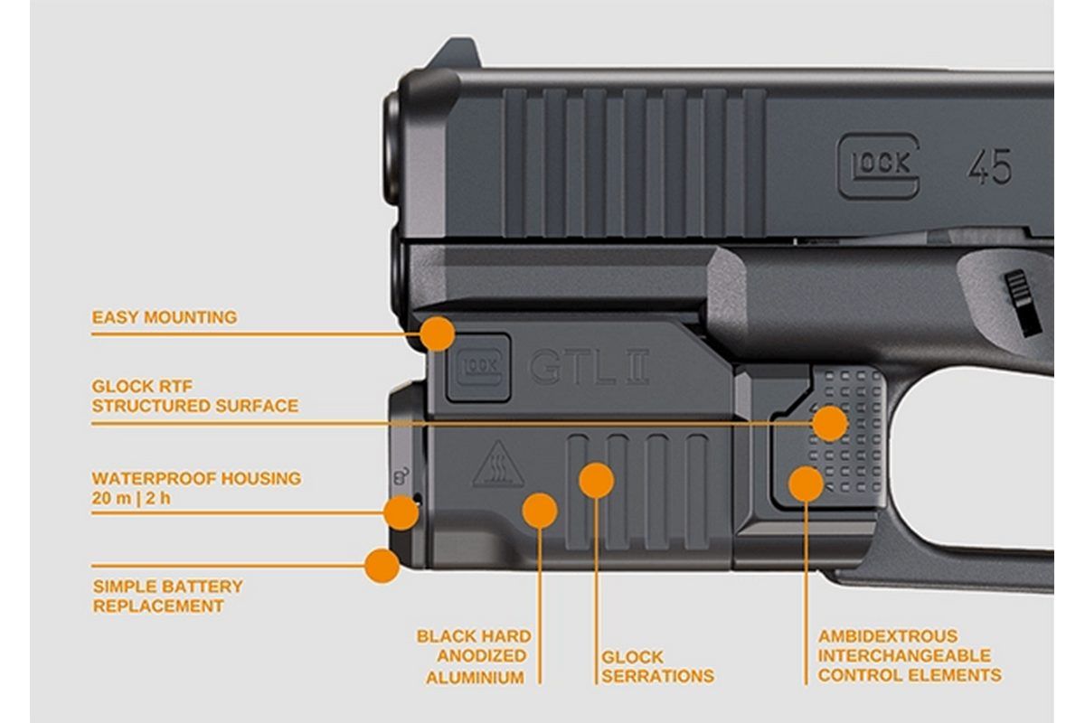 Die GLOCK GTL II wurde speziell für GLOCK Pistolen mit Montageschiene* entwickelt. Dieses neue LED Lichtmodul liefert 600 Lumen, um Ihr Ziel zu beleuchten. Das hochwertige Aluminiumgehäuse ist mit den mit der charakteristischen GLOCK Riffelung für bessere Griffigkeit ausgestattet und fügt sich nahtlos in das Pistolendesign ein. Das Licht lässt sich in Sekundenschnelle montieren und demontieren, was eine einfache Montage in jeder Situation ermöglicht.