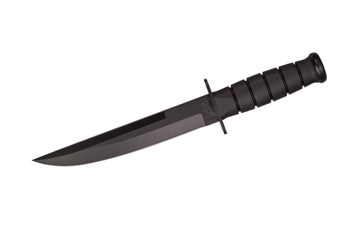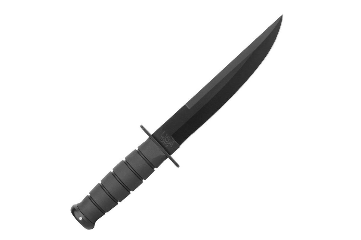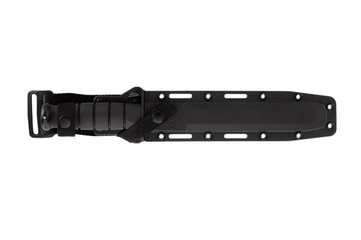 Ein zeitloses Messerdesign von Ka-Bar, mit modifizierter Tanto-Profilklinge, Kraton-Griff und Kunststoffscheide. Alles in schwarz.
