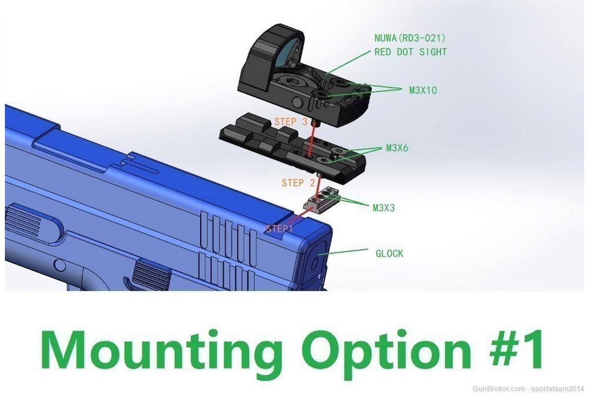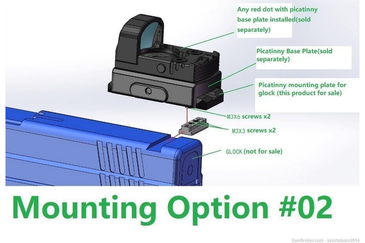 Diese Picatinny-Halterung bietet 2 Schienenschlitze. Jede Rotpunktoptik, die mit einer Picatinny-Platte ausgestattet ist, kann an dieser Picatinny-Schienenhalterung einer Glock-Pistole befestigt werden. Einige Red Dots wie Vortex Venom, Burris Fastfire und ADE RD3 werden mit dem Red Dot-Kauf mit einer Picatinny-Halterung geliefert. Der Benutzer kann die von Red Dot bereitgestellte Picatinny-Halterung verwenden, um sie sofort an dieser Picatinny-Schienenhalterung zu befestigen. Bitte beachten Sie: Einige rote Punkte wie Holosun und Trijicon RMR werden NICHT mit der Picatinny-Platte geliefert. Der Benutzer muss diese bei Bedarf separat kaufen.