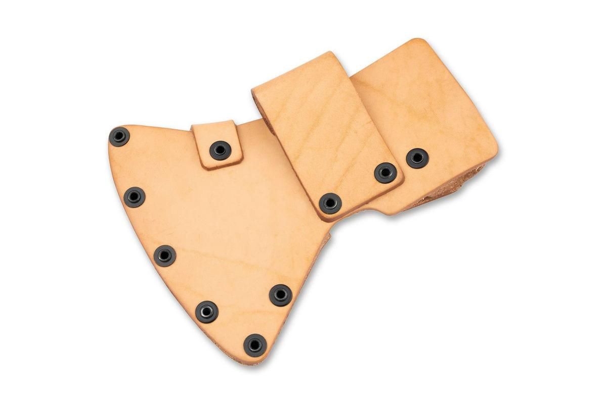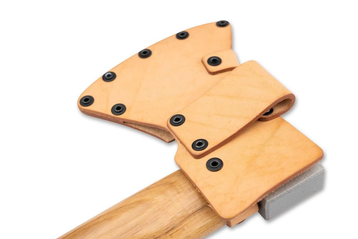 Die Appalachian Axt Scheide ist aus bestem dicken naturfarbenem Rinderjuchtenleder gefertigt und schützt die gesamte Schneide und deren Spitzen (Zehe und Ferse) zuverlässig. Die Keder ist mit 6 starken scheibenunterlegten Nieten versehen. Zwei eng gepasste Druckknopfriegel halten die Axt sicher in Position.