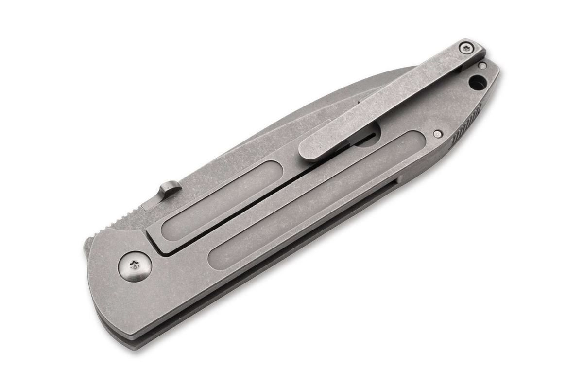 Das Stonewash-Finish über das gesamte Messer hinweg sorgt für den kernigen Look. Präzision und Stabilität sind die integralen Bestandteile des Edelstahlgriffs, dessen Schalen und Clip (Tip-Up/r) aus dem Vollen gefräst sind und mit den länglichen Aussparungen den industriellen Charme des Evade unterstreichen.