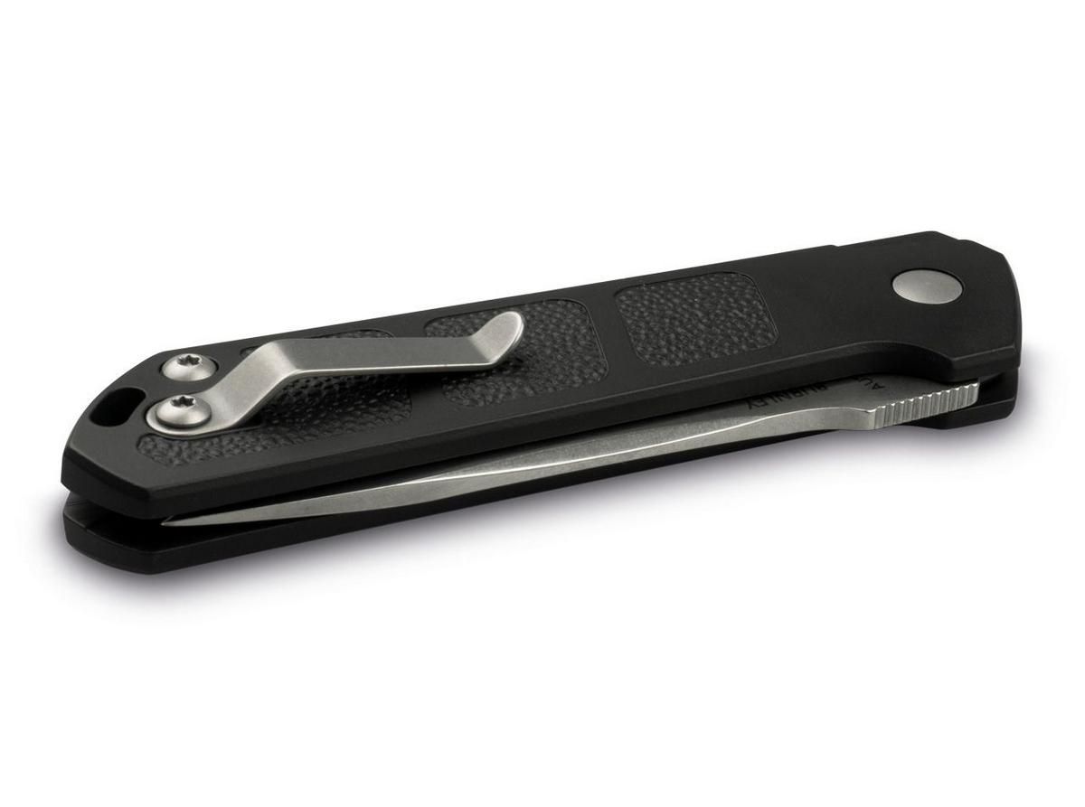 Die schwarzen Griffschalen bestehen aus leichtgewichtigem Aluminium und sind mit texturierten Flächen versehen. Mit Fangriemenöse, kurzem Clip (Tip-up) und hochwertigem Nylon-Etui zur Aufbewahrung.