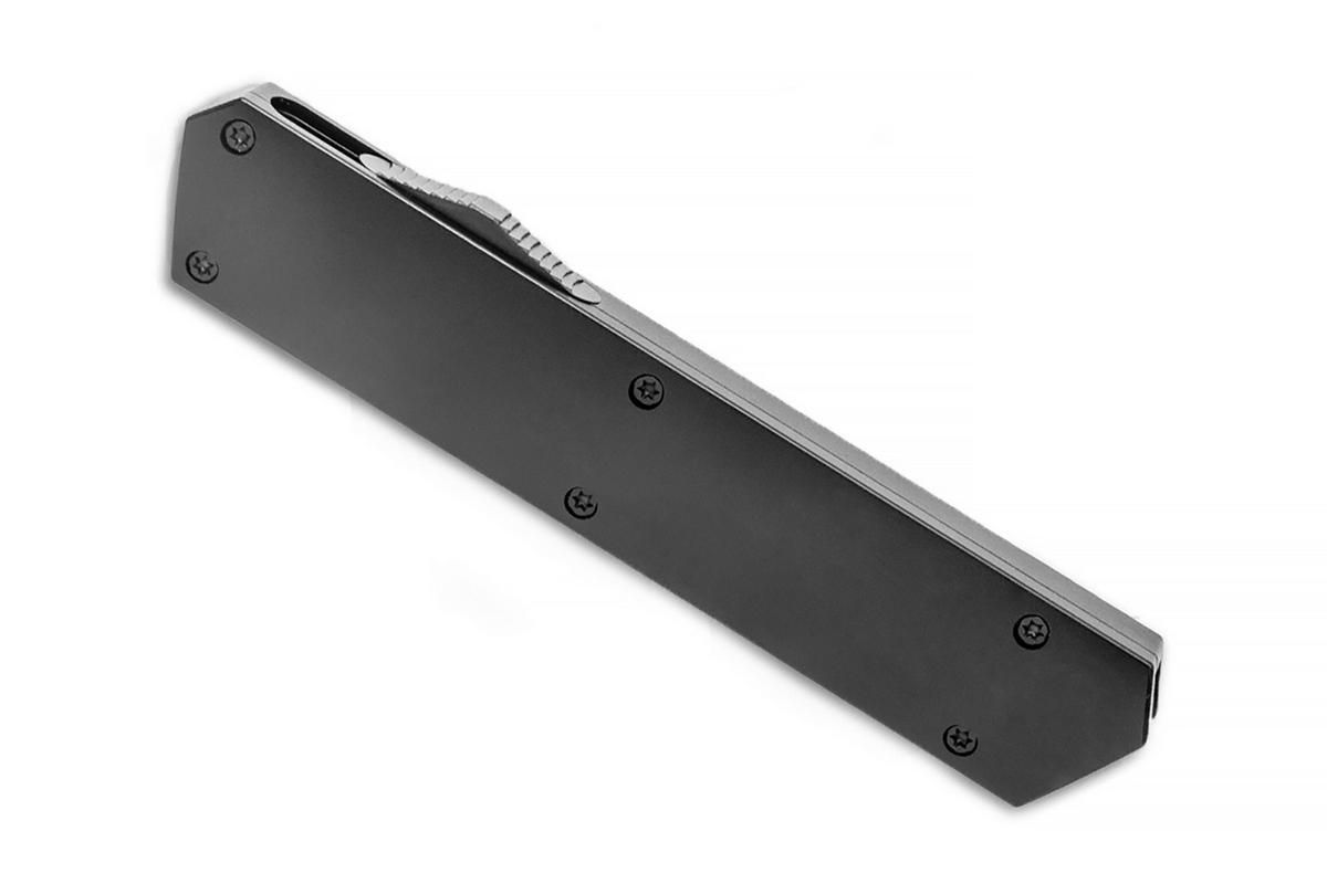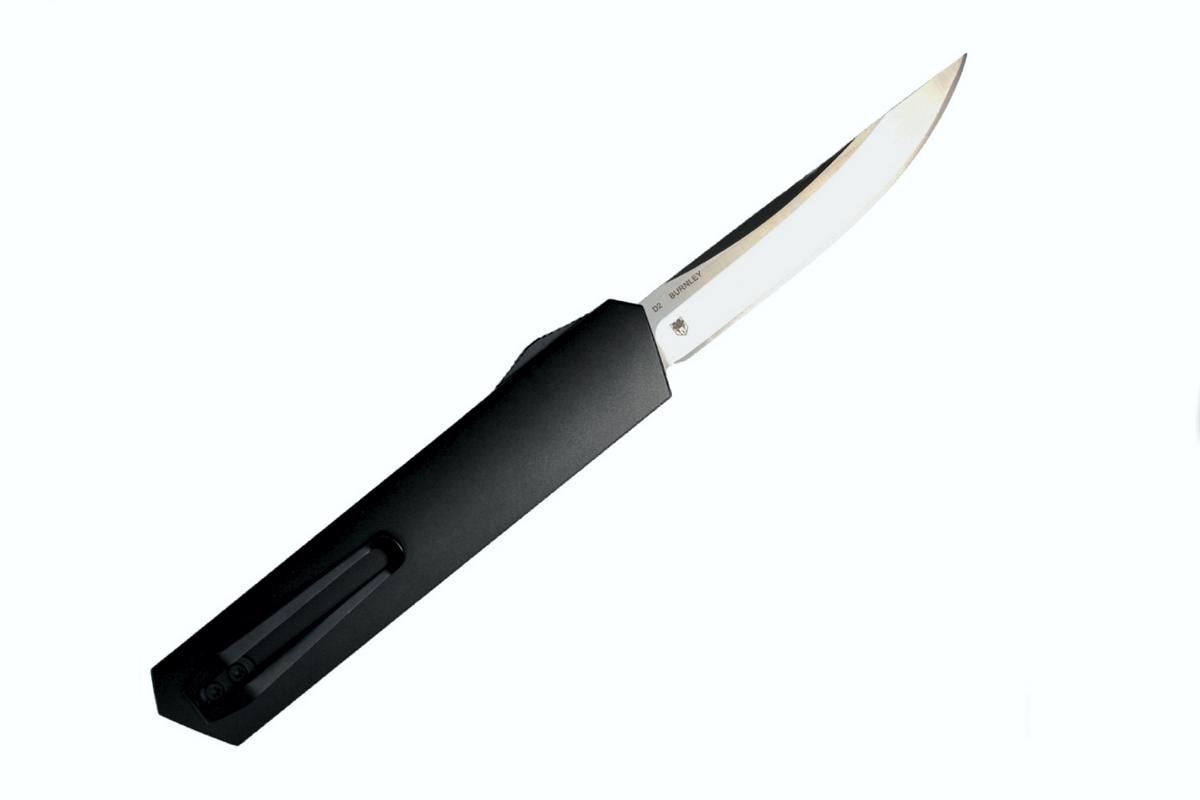 Das Böker Plus Kwaiken OTF Black kombiniert das schlanke, minimalistische Design mit einem perfekten Automatikmechanismus. Wird der geriffelten Auslöser auf der Griffoberseite nach vorne geschoben, springt die satinierte Klinge aus D2 in atemberaubender Geschwindigkeit frontal aus dem CNC-gefrästen Aluminiumgriff und verschwindet beim Ziehen des Auslösers wieder in selbigem.