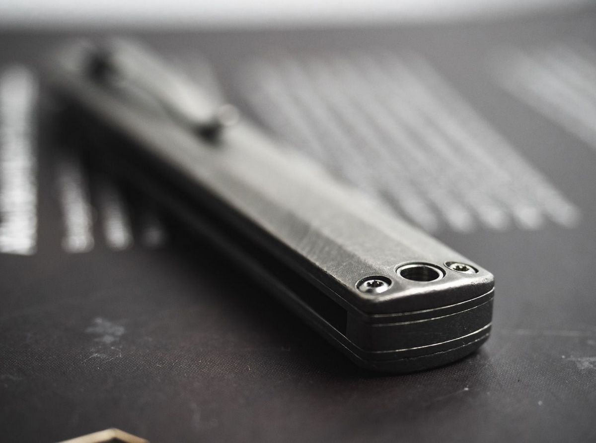 Die kugelgelagerte Klinge aus rostfreiem Damast besteht aus 110 Lagen, öffnet per Frontflipper und wird als Slipjoint beidseitig von einem Detent-Ball unterstützt. Die Griffschalen werden aus hochfestem Titan gefertigt und sitzen auf Titanplatinen, die mit gewichtsreduzierenden Aussparungen versehen sind. Mit verstärkter Fangriemenöse, demontierbarem Titan-Clip (Tip-down/r) und hochwertigem Nylon-Etui zur Aufbewahrung.