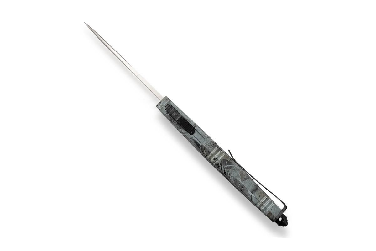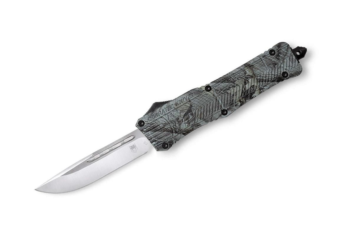Die ausgewachsene Variante des beliebten CTK-1 überzeugt mit einer soliden D2 Drop Point Klinge, die pfeilschnell per Knopfdruck aus dem vorderen Griffstück kommt und bei erneutem Betätigen wieder dort verschwindet. Das OTF Messer (Out The Front) ist mit einem texturierten Griff aus hochfestem Aluminium versehen, der in einem waldgrünen Tarnmuster gehalten ist.