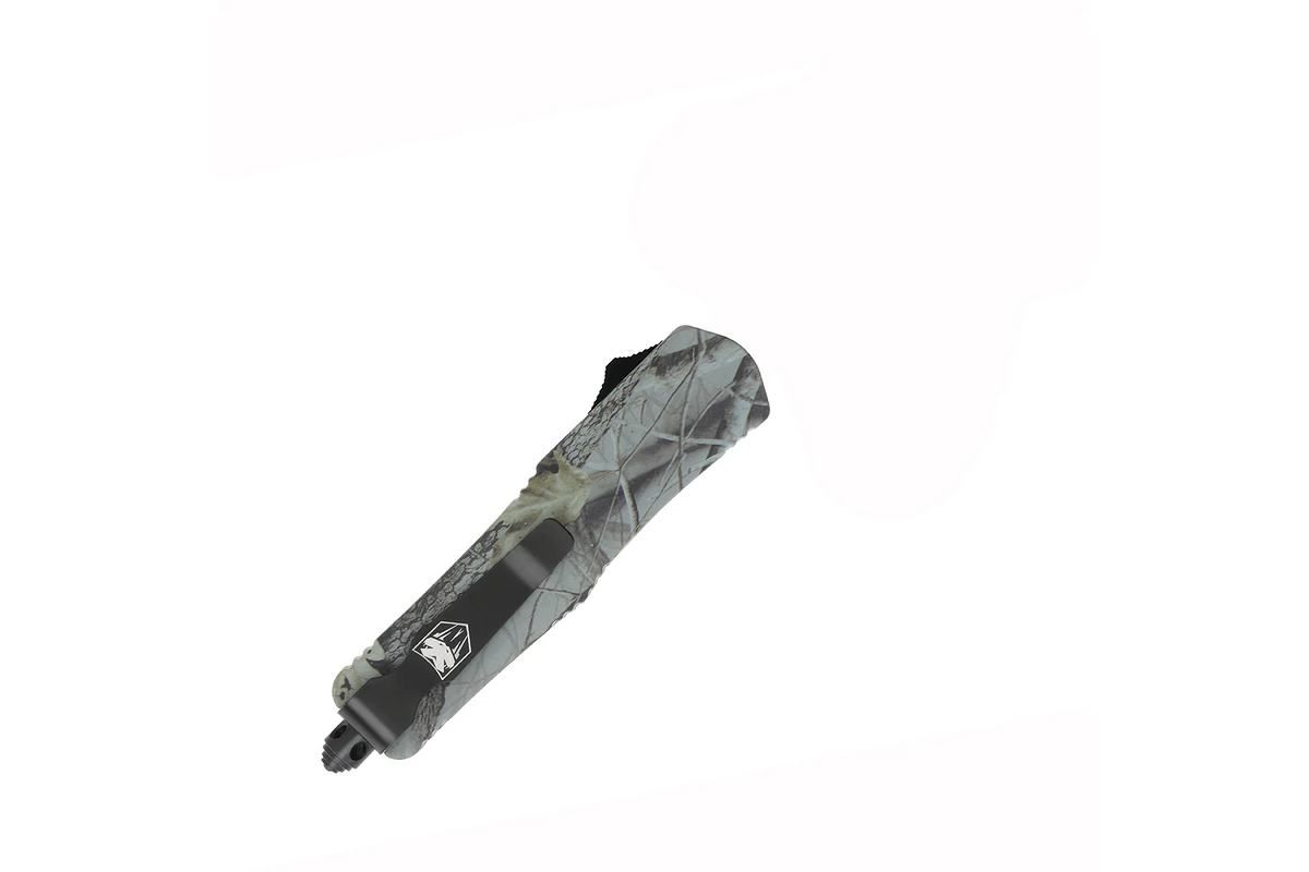 Das kleine FS-3 Woodland verfügt über einen Griff aus hochwertiger Aluminiumlegierung und eine hochwertige, einseitig gezahnte Dolchklinge aus D2-Werkzeugstahl und verfügt über eine Doppelfunktion (das Ausfahren und Zurückziehen der Klinge erfolgt durch Drücken oder Ziehen desselben Steuerschalters).