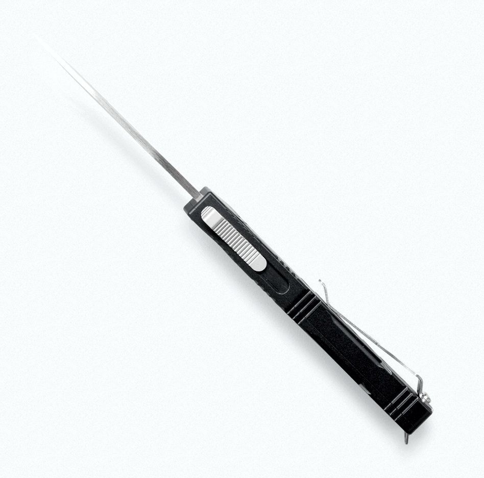 Das CobraTec Special Forces OTF (Out The Front) Black ist mit einer robusten Klinge aus D2 und einem strukturierten Griff aus Aluminium ausgestattet. Die Klinge kommt via Knopfdruck automatisch aus dem vorderen Griffstück (out the front) heraus. Mit Nylon Etui, Glasbrecher und Clip (Tip-down/r.)