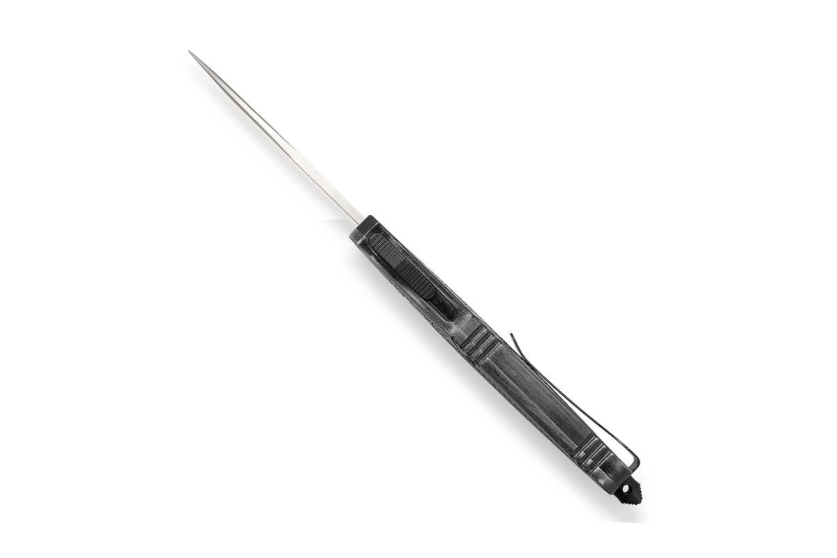 Das OTF Messer (Out The Front) ist mit einem texturierten Griff aus hochfestem Aluminium versehen, der in einem Stonewash Finish gehalten ist. Der Deep-Carry Clip ist am Glasbrecher befestigt und erlaubt eine beidseitige Tip-Down Trageweise. Lieferung mit hochwertigem Nylon Etui.