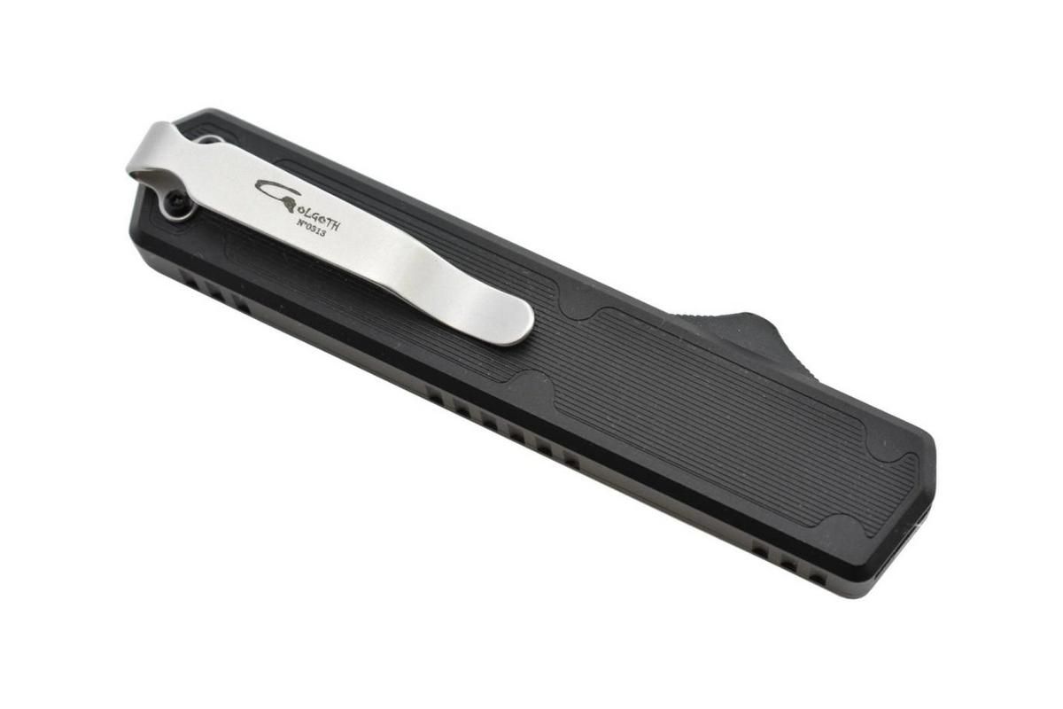 Golgoth Double Action OTF automatic knife with a D2 steel tanto blade and an aluminum handle with carbon fiber insert on one side. The knife is equipped with a steel pocket clip with the serial number on it.