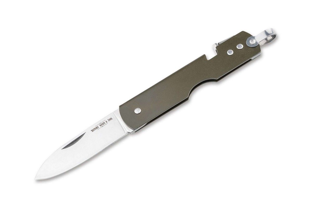 The special highlight is an integrated can opener modeled on the legendary US Army Pocket Can Opener P-38. This is attached to the handle with two solid rivets and can be locked with the lanyard bracket to prevent unintentional opening. The medium-pointed blade made of 440 stainless steel has a nail cutter to aid opening. The handle is painted in the authentic olive drab color based on a historical model.