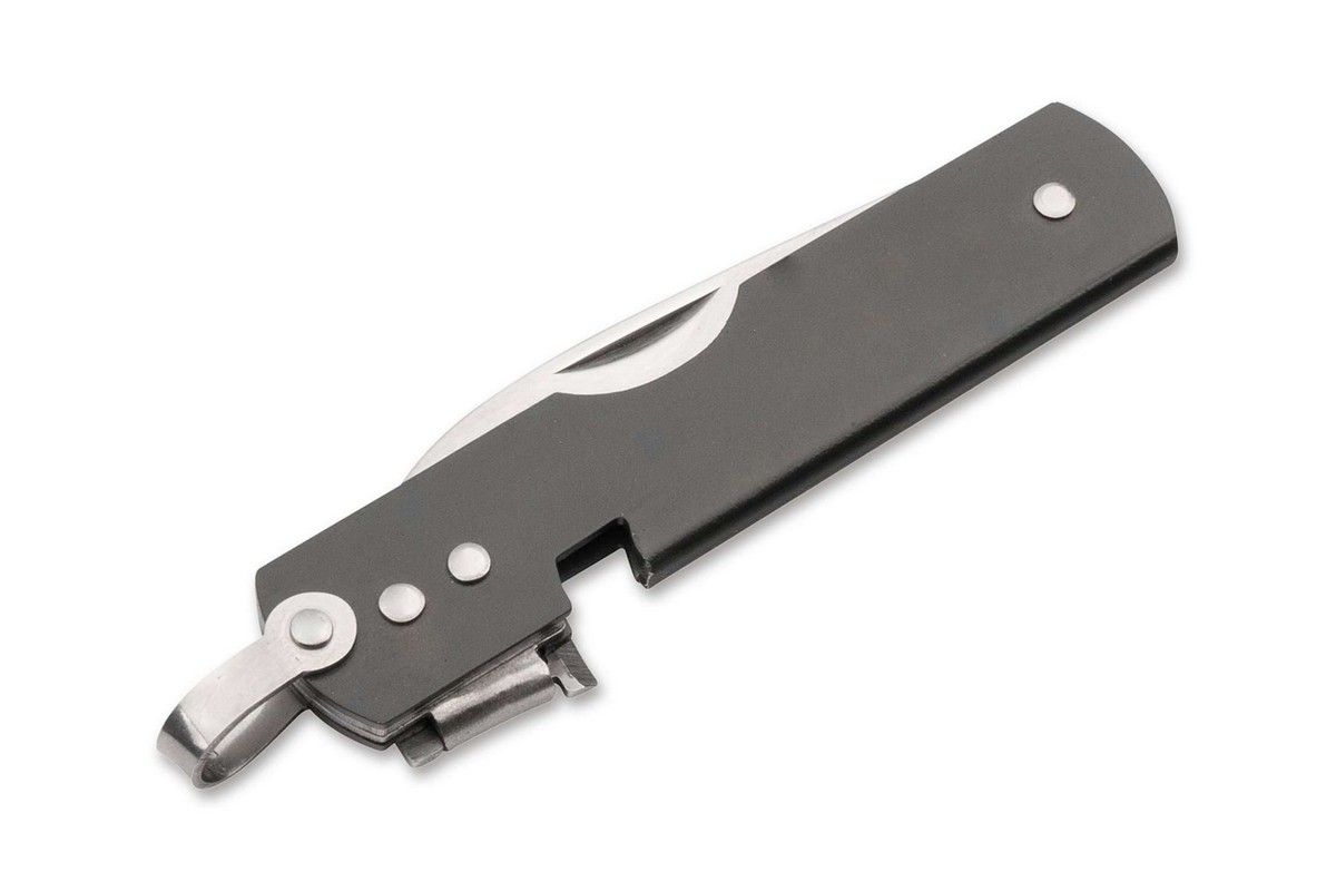 This extremely small and flat knife fits everywhere: in jeans, field harness, lunch box, survival kit or even in your wallet. The simple construction made of bent stainless steel sheet enables manufacturing costs to be so low that you can afford to store a backup knife in several places.