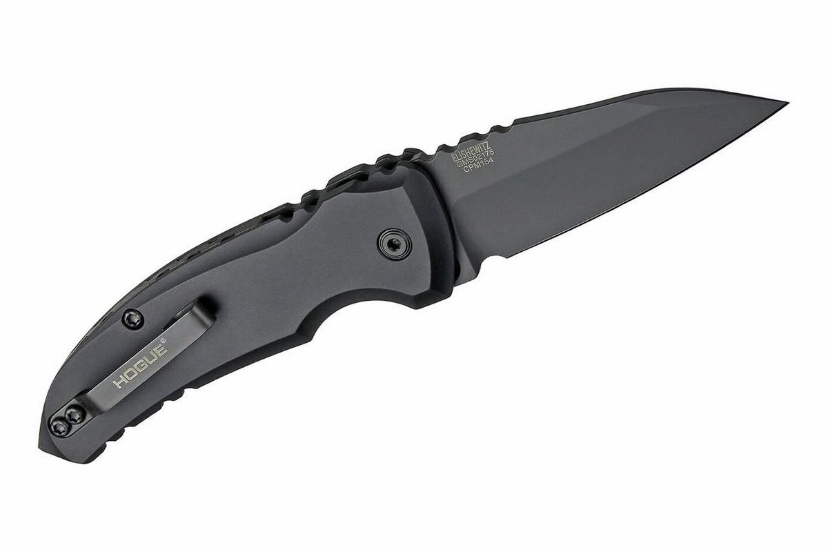 Das kompakte Hogue Microswitch Automatikmesser A01 ist in dieser Version mit einer beschichteten Wharncliffe-Klinge ausgestattet. Auch der Hartcoat-anodisierte Aluminiumgriff mit umsetzbarem Clip (Tip-up/l-r) ist komplett schwarz. Die pulvermetallurgische Klinge lässt hier keine Wünsche offen. Die kräftige Feder garantiert schnelles und zuverlässiges Öffnen und kann mit der Zusatzsicherung gesperrt werden.