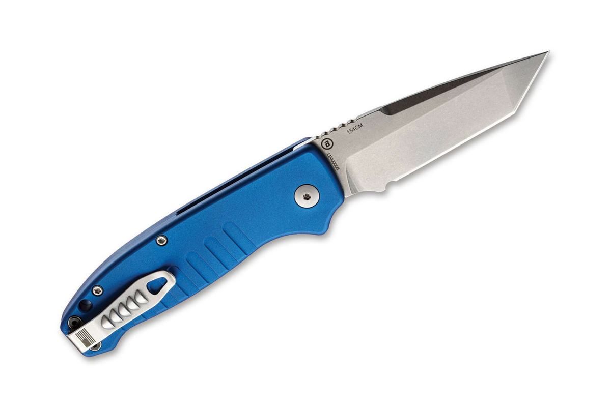 Elegant und praktisch zugleich ist der wohlgeformte blaue Aluminiumgriff, der ein sicheres Arbeiten ermöglicht. Mit Fangriemenöse und umsetzbarem Deep-Carry-Clip (Tip-up).