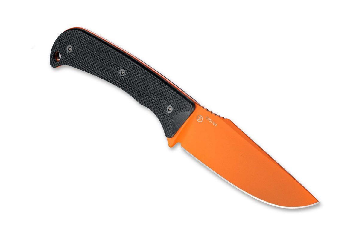 The full tang hunting knife comes with a flat ground, orange clippoint blade made of powder metallurgical CPM-M4 and textured black G10 handle scales.