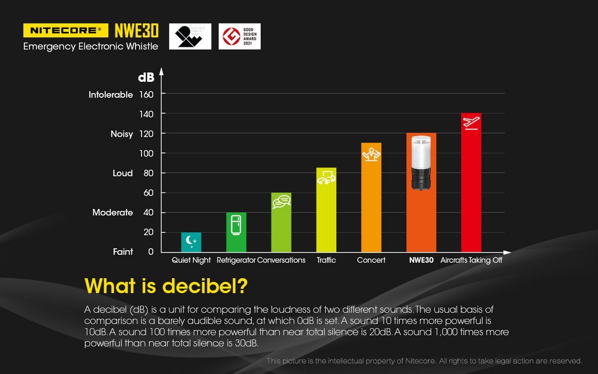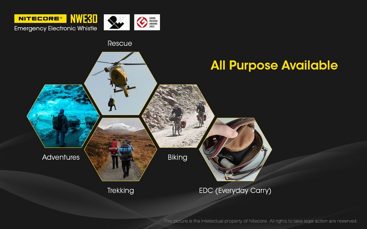 The NITECORE NWE30 is an ultra compact emergency electronic whistle with an easily operable twist-and-buzz interface. Available with a 360-degree buzzing of 120dB, it will also automatically emit an omnidirectional beacon signal flashing of 2,000 lumens at night. With a max runtime of 72 hours, it aims to seize your best opportunity of being rescued.