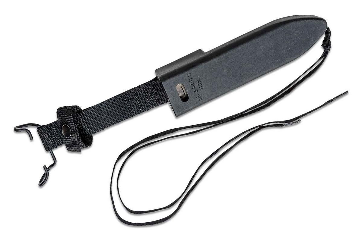 Die schlagfeste Scheide aus Kunststoff hat zwei Metallspangen, die die Klinge spielfrei halten. Inkl. Messing Bügel für US Lochkoppel und Gürtelschlaufe.