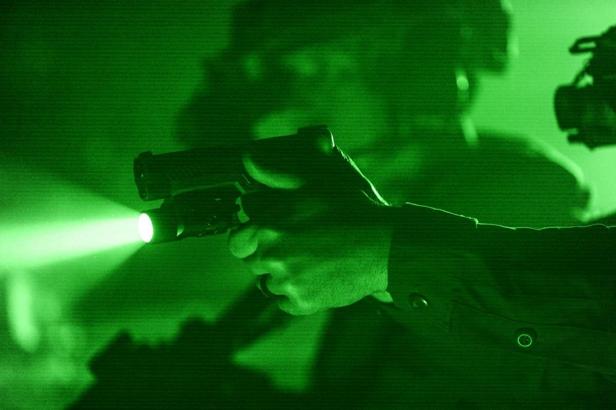 Flaches, an der Waffe montiertes taktisches Licht mit integriertem IR-LED-Illuminator/Laser und sichtbarem weißem LED-Illuminator. Der Benutzer wechselt von Weißlicht zu IR, ohne die Augen vom Ziel entfernen oder seinen kontrollierten Schussgriff ändern zu müssen. IR erfordert Nachtsichtgerät oder Nachtsichtzielfernrohr..