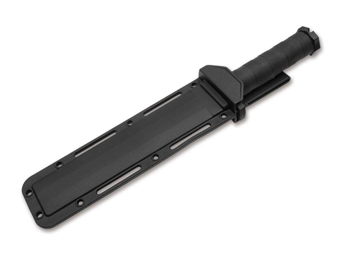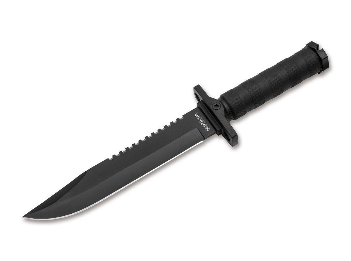 Öffnungen im Handschutz erlaubt das Fixieren des Messers mit Schnur, Draht, Kabelbinder oder Gewebeklebeband, sodass es zum Beispiel auch als behelfsmäßiger Speer eingesetzt werden kann. Die kraftvolle Bowie-Klinge aus rostfreiem und schockelastischem 7Cr17MoV ist schwarz beschichtet und zusätzlich mit der typischen Rückensäge versehen.
