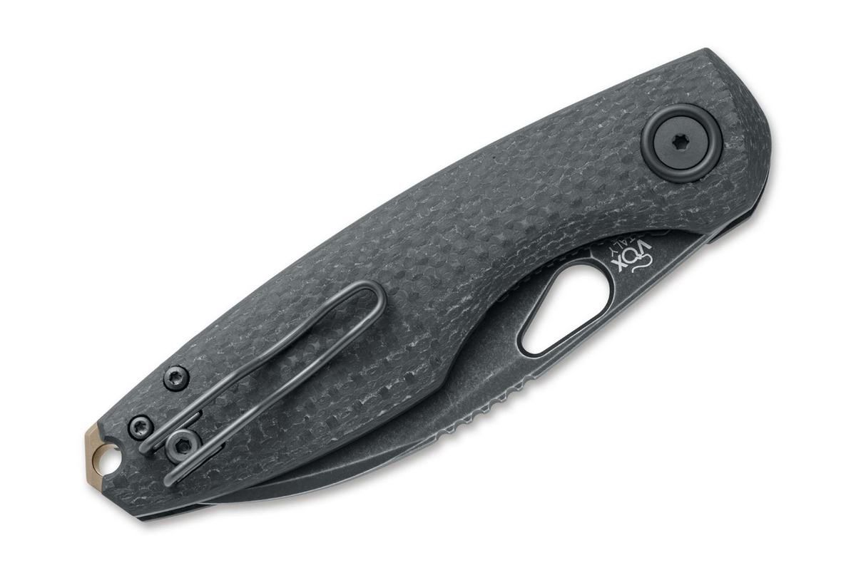 Der stabile Liner Lock verriegelt die Klinge und strahlt damit die nötige Ruhe aus. Der ergonomische Griff aus Kohlefaser sorgt für eine ausgewogene Handlage und ist mit einem umsetzbarem Drahtclip ausgestattet (Tip-Up).