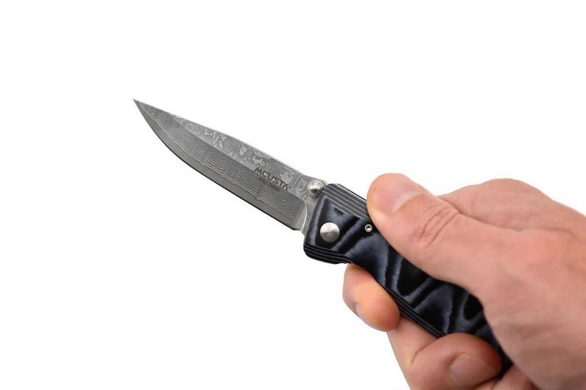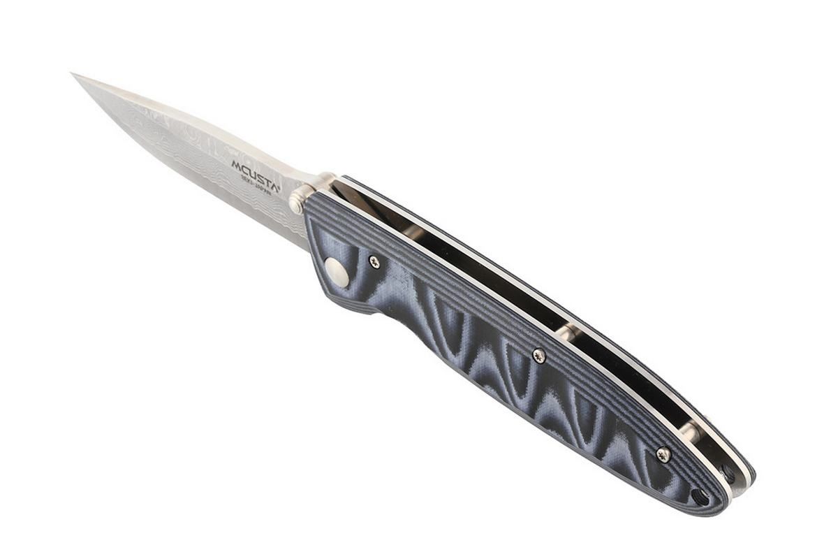 Mcusta wird in Seki, Japan, hergestellt und kombiniert moderne Technologie mit traditioneller japanischer Handwerkskunst, um handgefertigte, maßgeschneiderte Qualitätsmesser herzustellen. Dieses Messer ist im geschlossenen Zustand 11,1 cm lang und verfügt über eine Klinge aus 33-lagigem Damast-Edelstahl mit VG-10-Kern und einen blauen Micarta-Griff mit rechtshändigem, mit der Spitze nach unten gerichtetem Taschenclip (nicht umkehrbar).