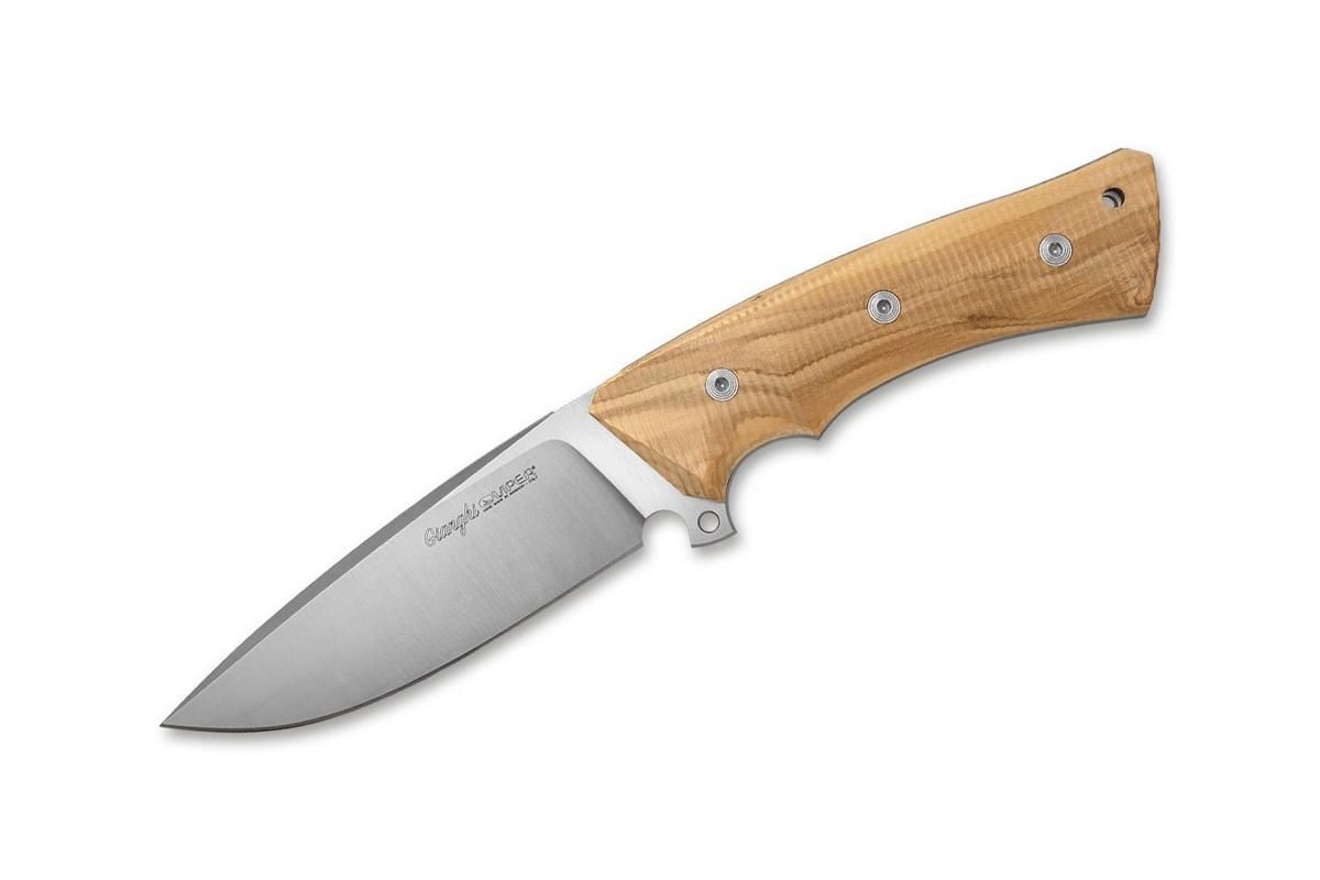 Details wie der sanft gerundete Klingenrücken oder die dezente, aber wirksam geriffelte Daumenauflage setzen Akzente, die das Gesamtbild perfektionieren. Mit satinierter Klinge und Griffbeschalung aus ausgesuchtem Olivenholz.